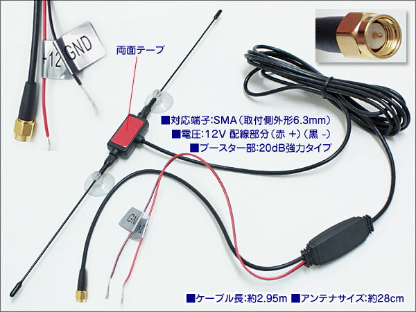 地デジアンテナ 吸盤付 ダイポール TV SMA端子 強力ブースター付 配線長300cm ワンセグ フルセグ カーナビ 地上デジタル (ゆうパケットなら送料無料) crd
