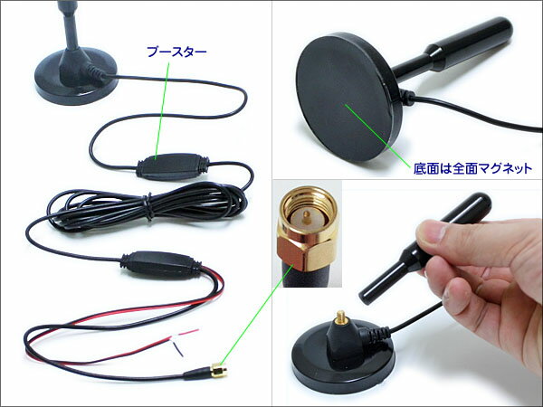 地デジアンテナ 自立ポールアンテナ 底面マグネット SMA端子 TV 強力ブースター付 配線長300cm 車 カー用品 ワンセグ フルセグ カーナビ crd